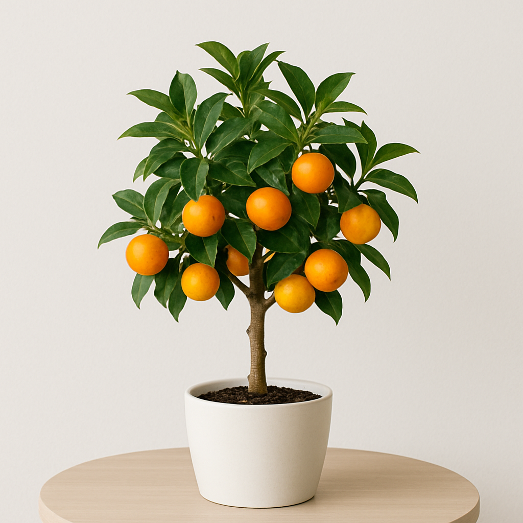 - Mažas: 12 cm skersmens vazonas, 3–5 vaisius ir kompaktiška lapija, tinkamas mažoms erdvėms.