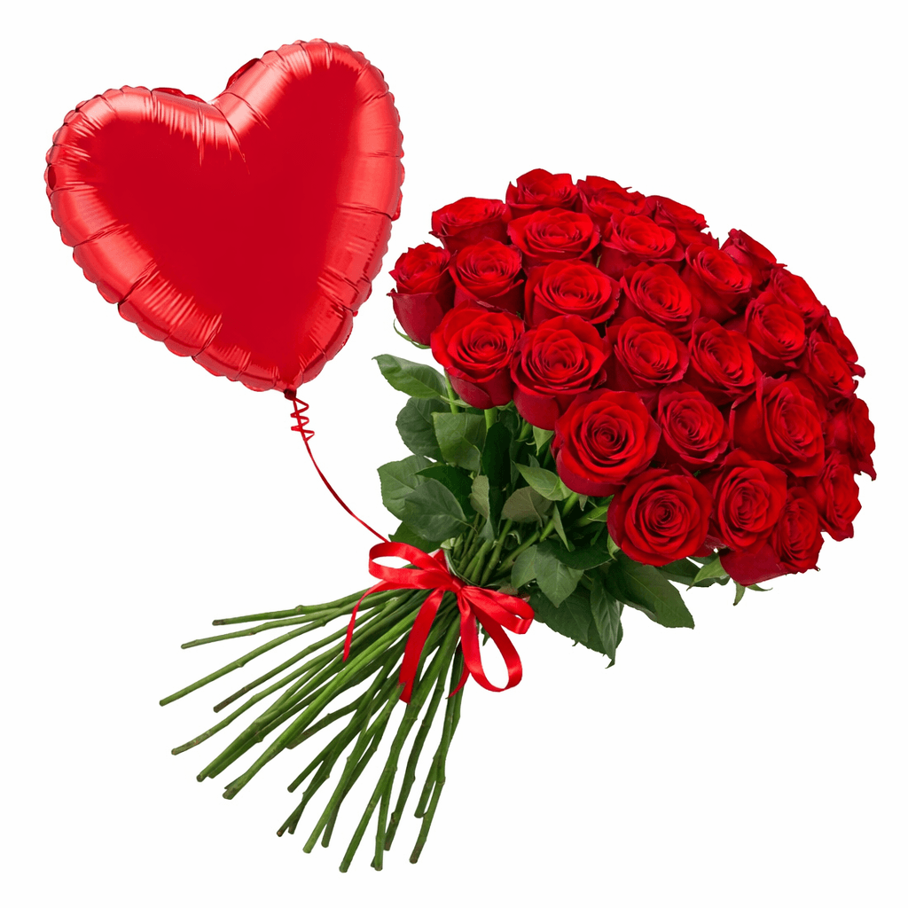 Raudonų rožių puokštė, rožės surištos į spiralę plius širdies formos folinis balionas pripildytas helio dujų.