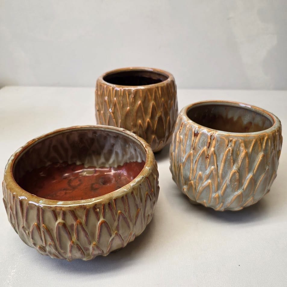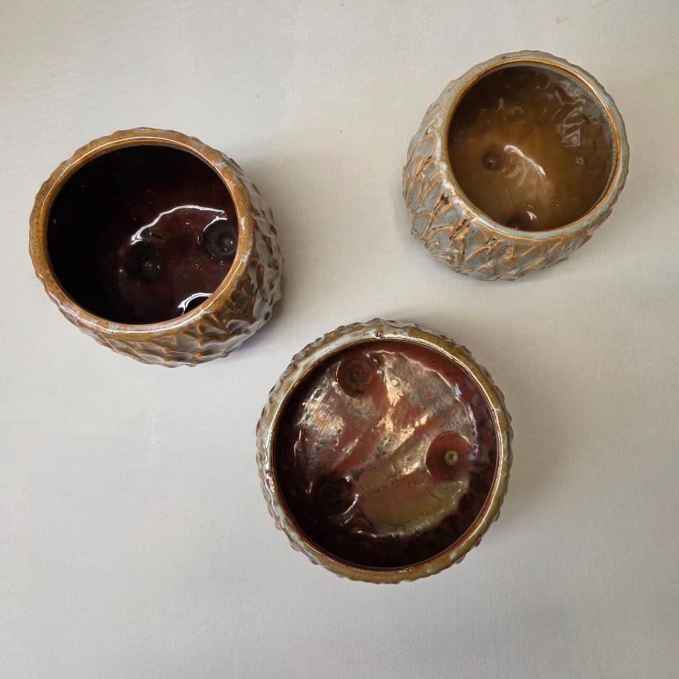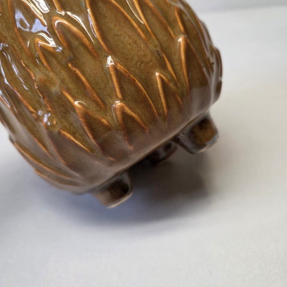 Glazūruotos keramikos rusvų atspalvių vazonas.