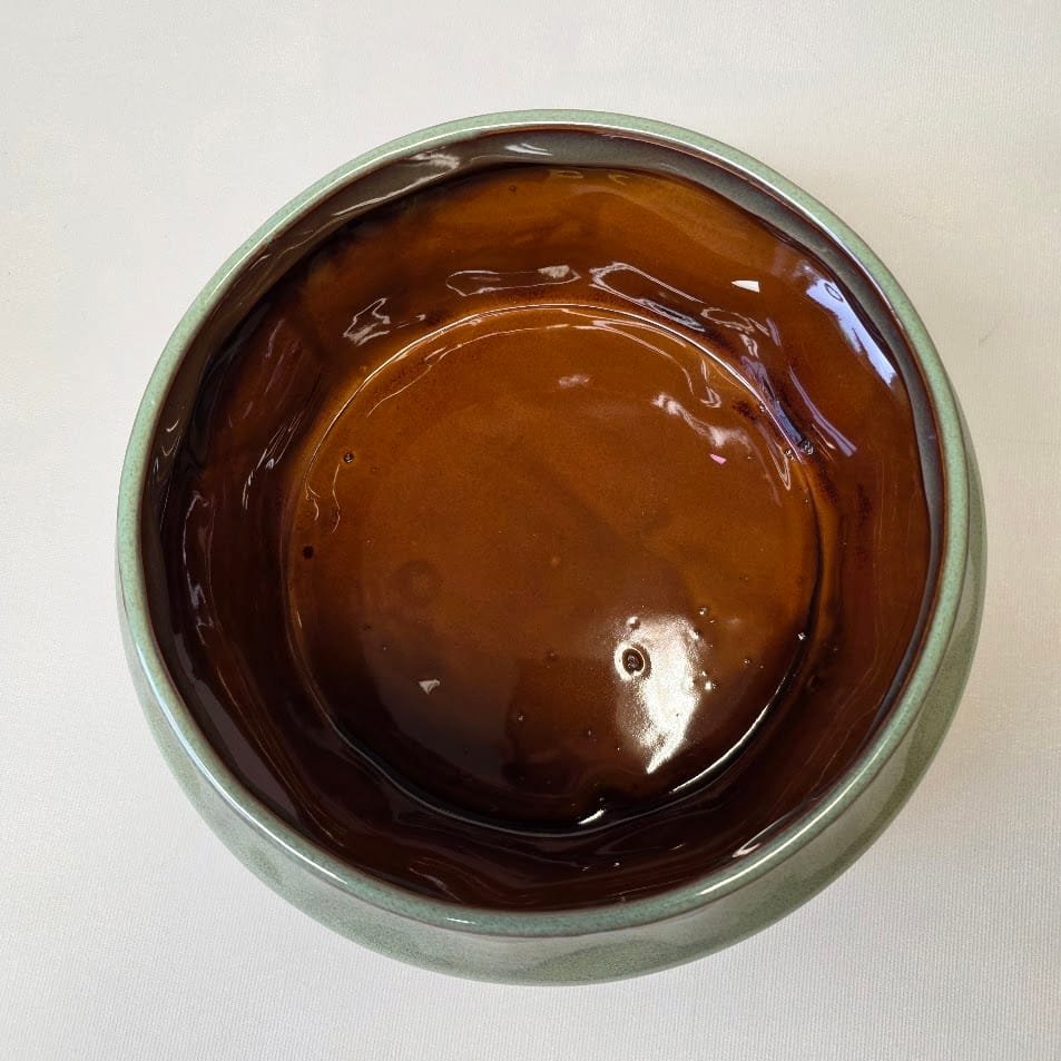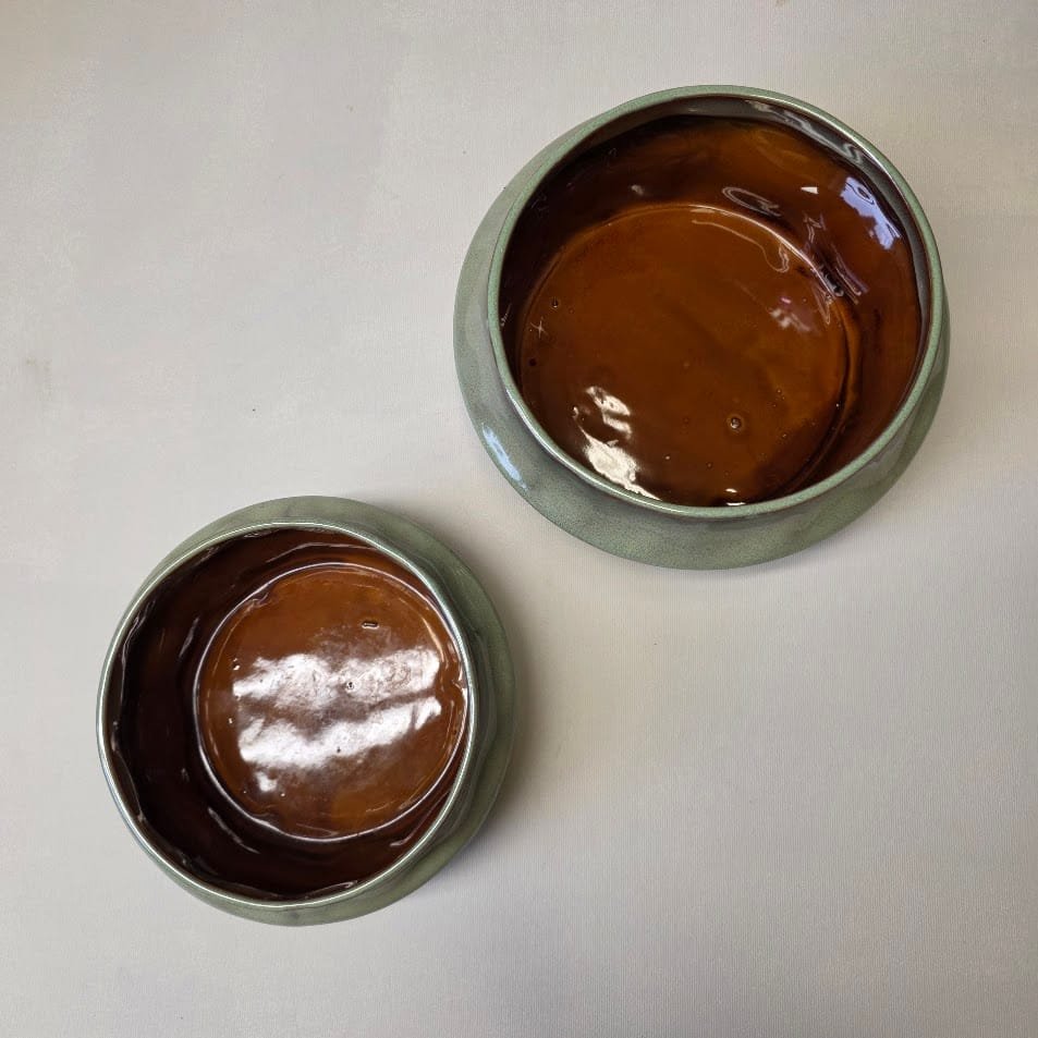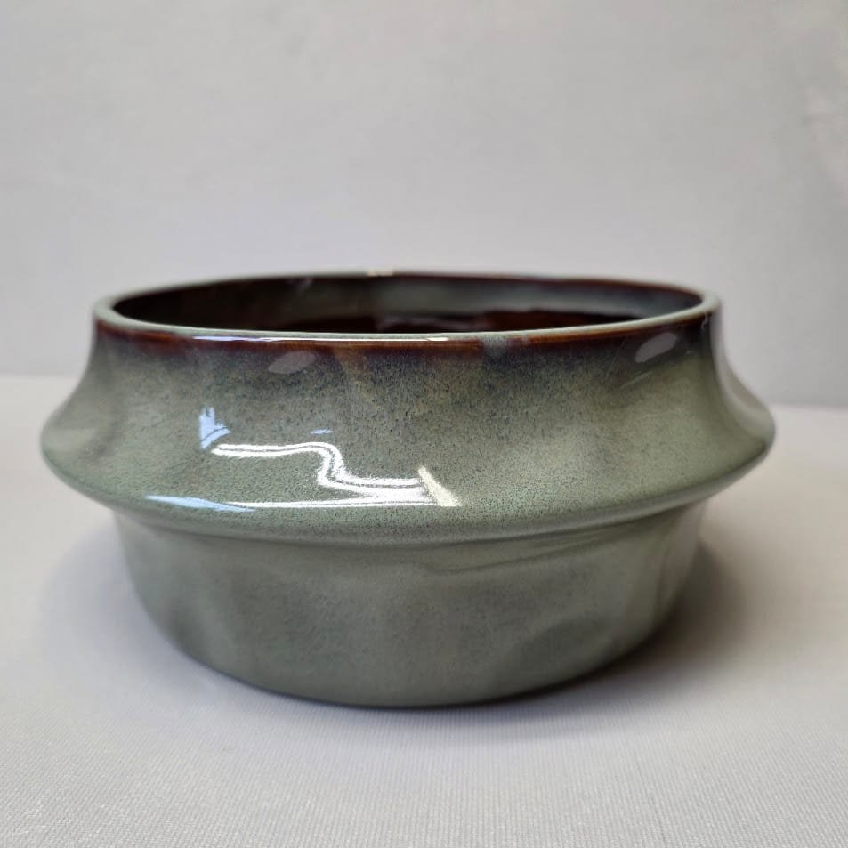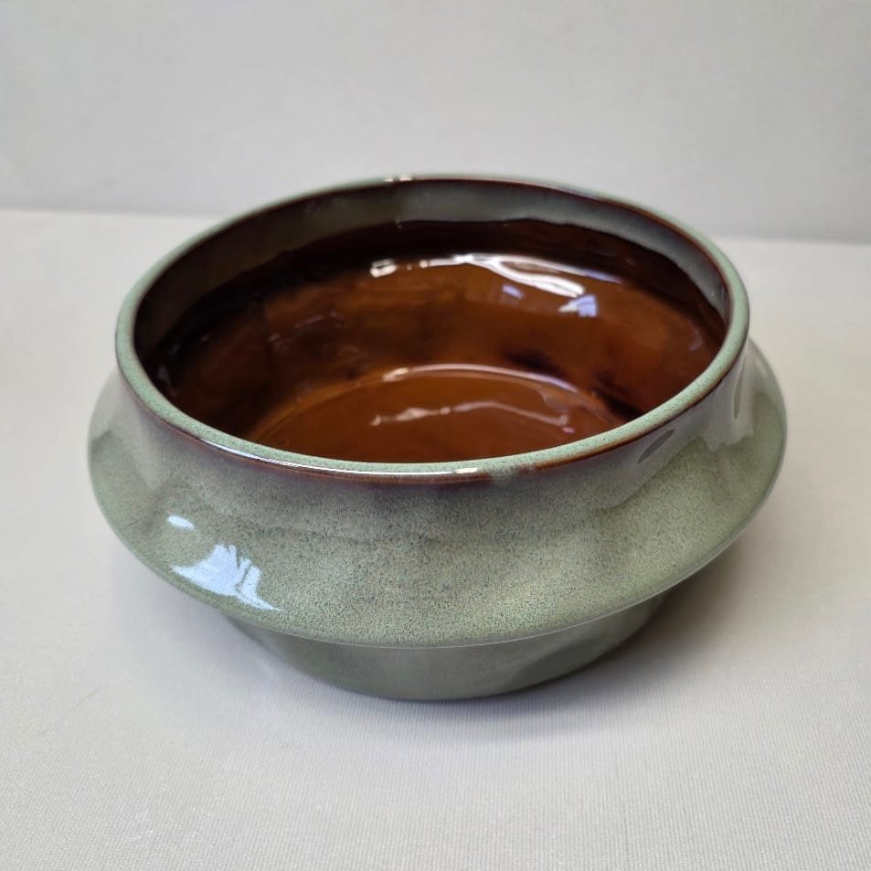 Glazūruotos keramikos žalios, samaninės spalvos vazonas.